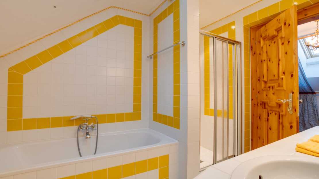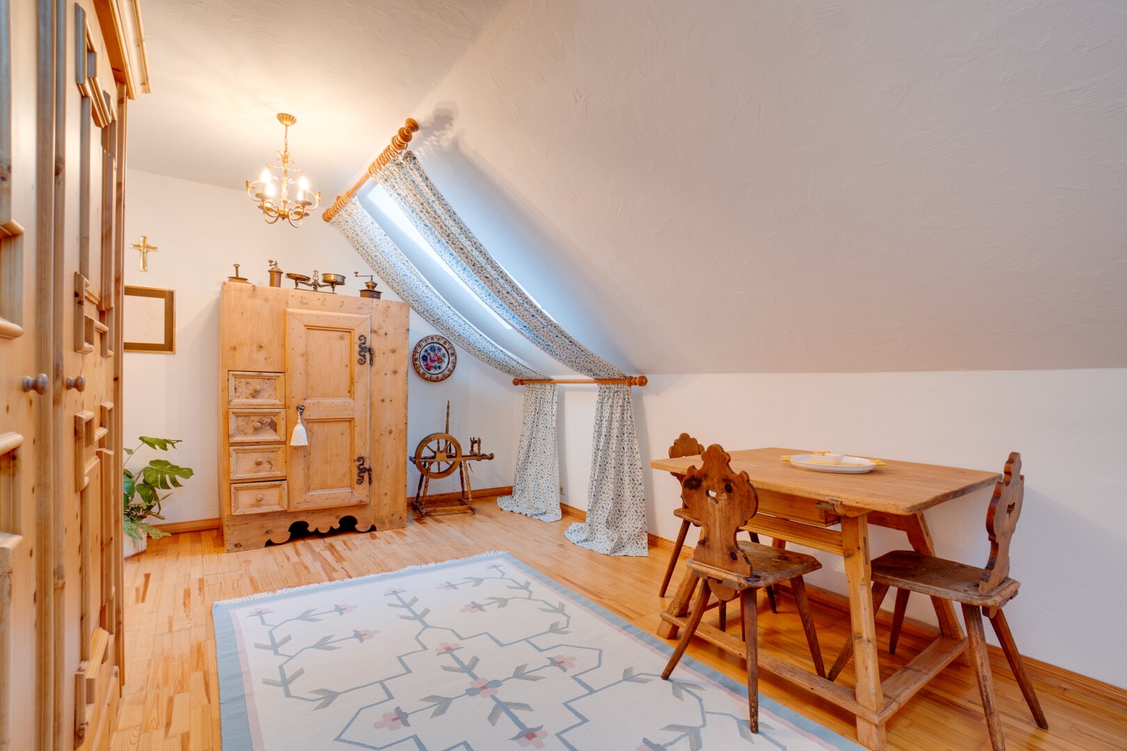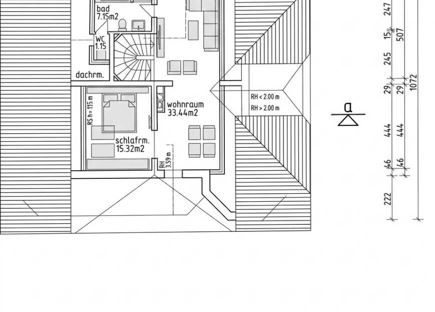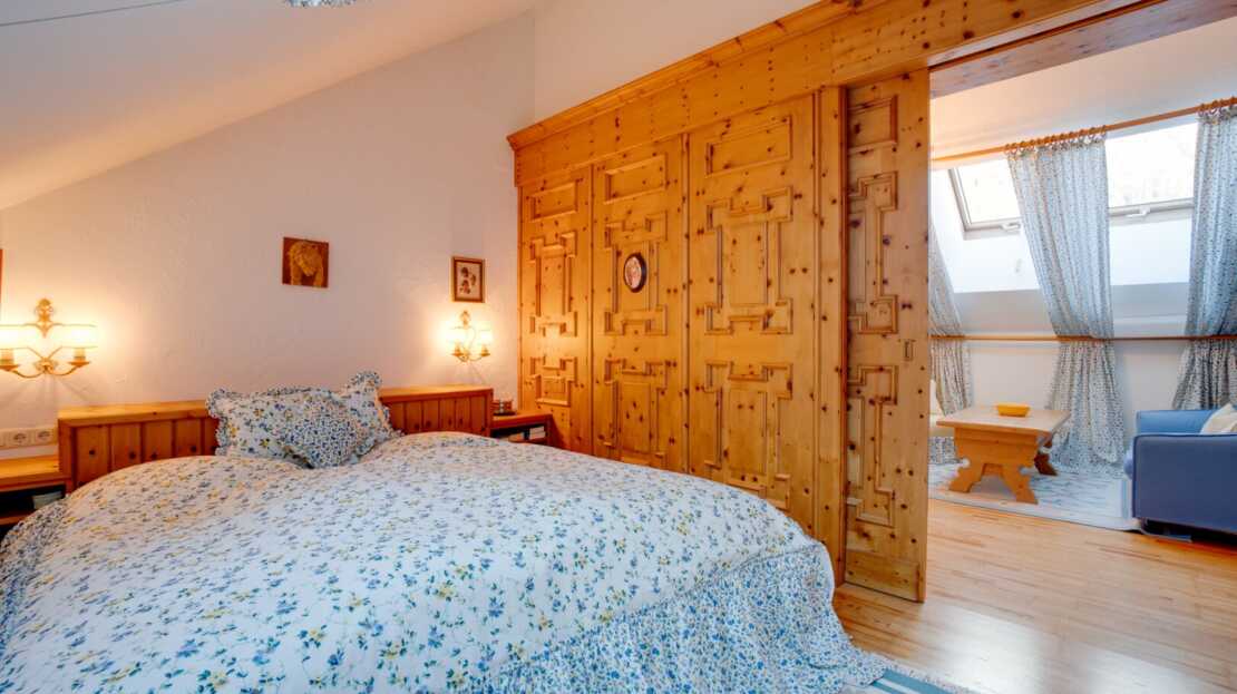 DG: Appartement mit Wohnbereich und Schlafzimmer, Dachraum, Bad (Wanne, Dusche, WC)