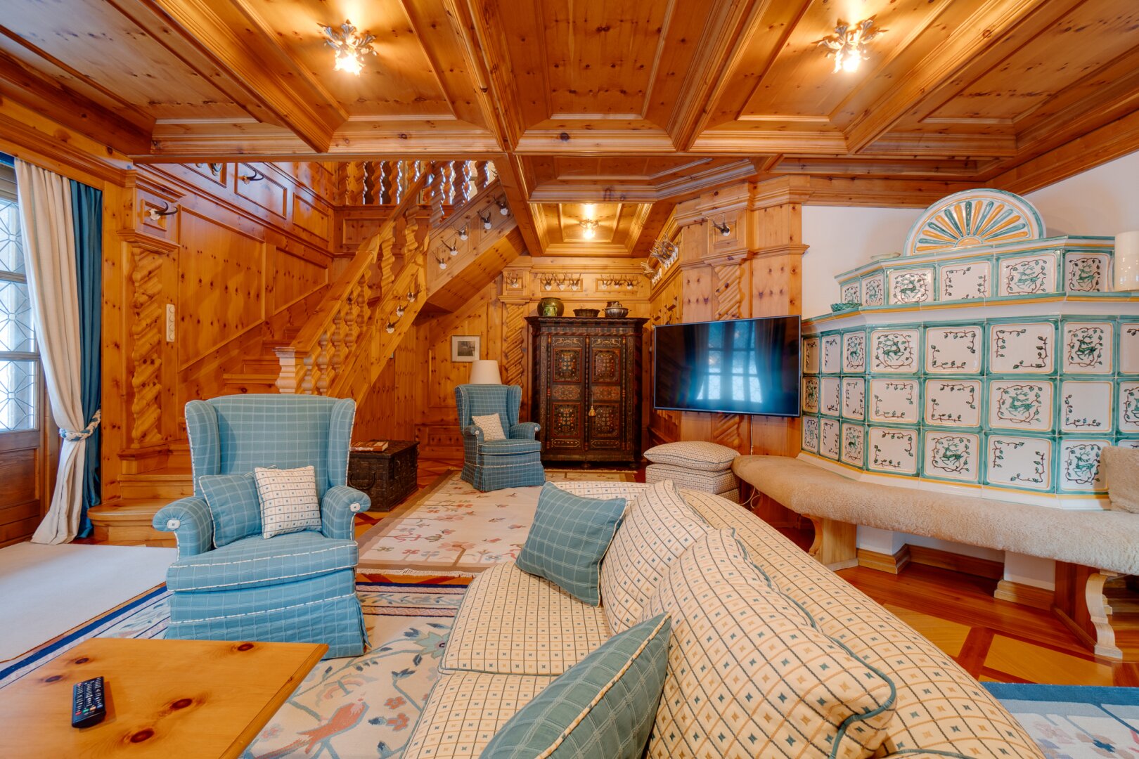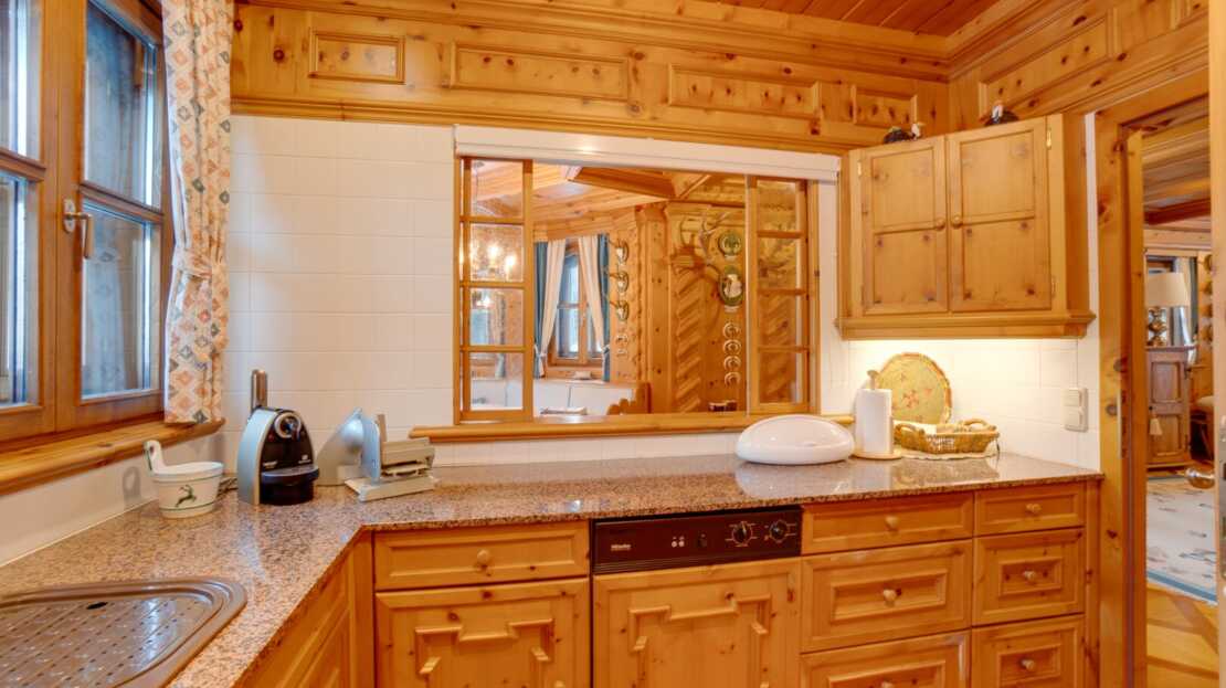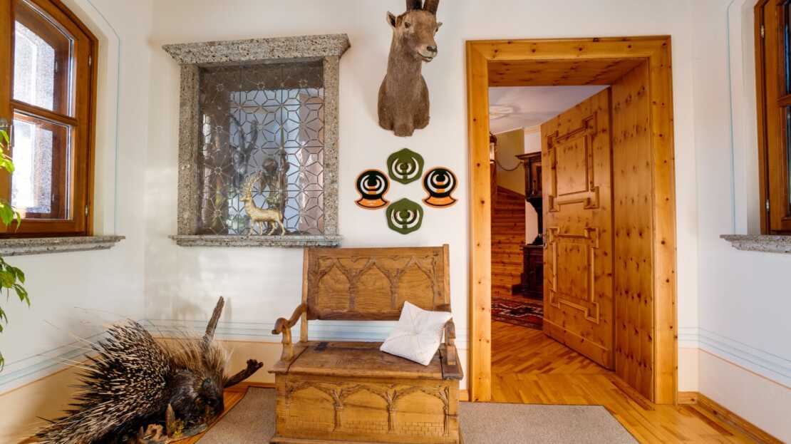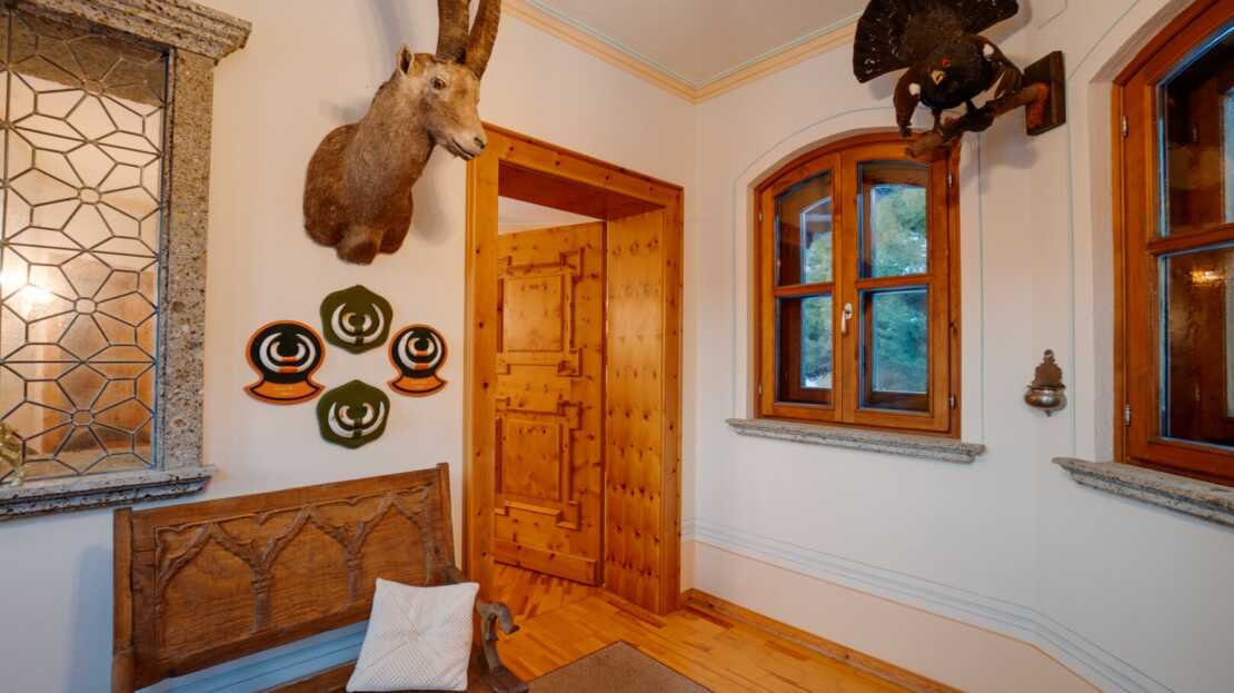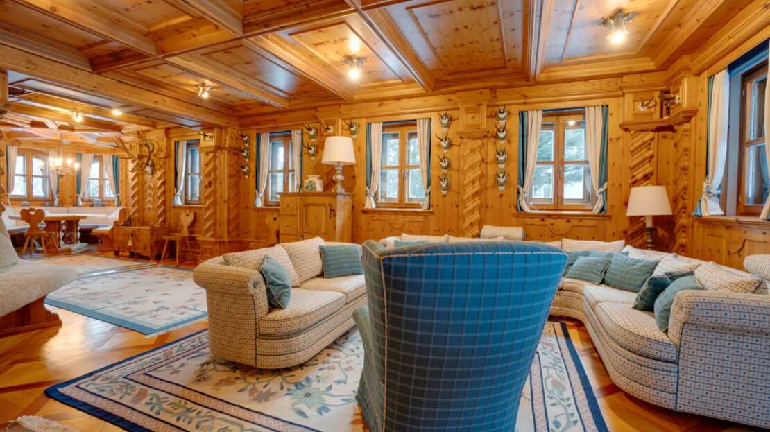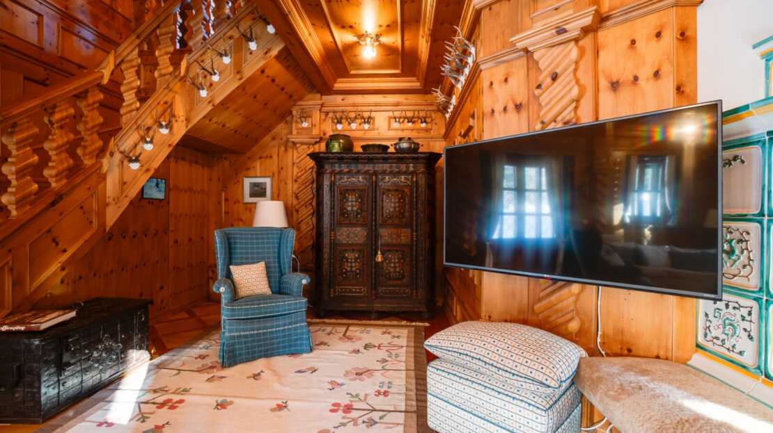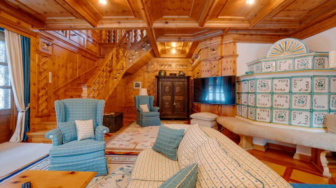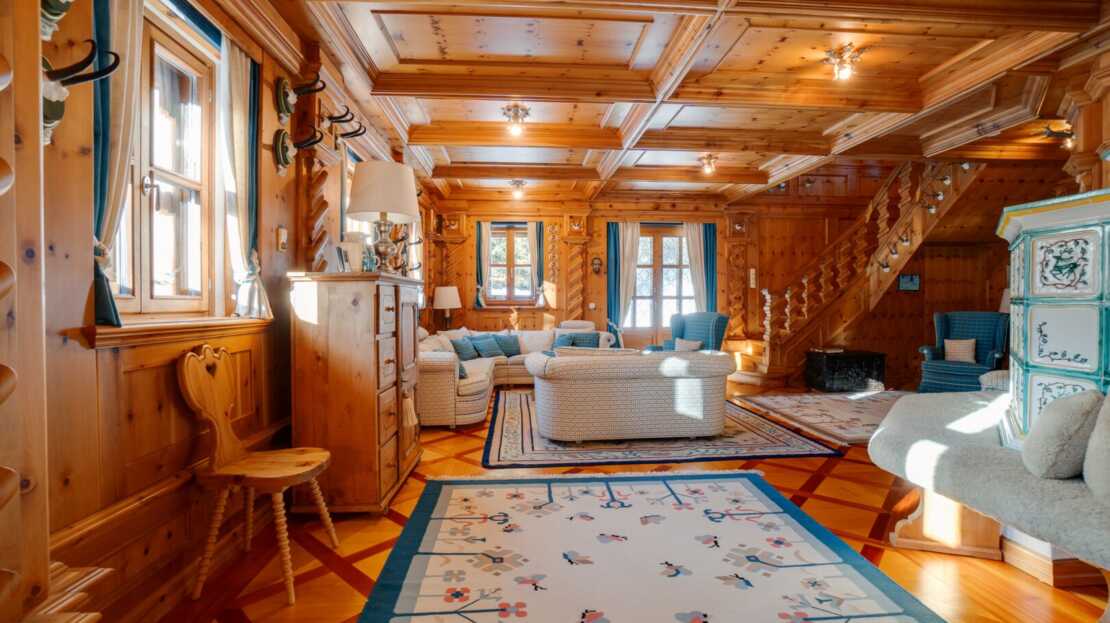 Das Interieur des großzügigen Chalets, welches von einem renommierten Architekten entworfen wurde, ist geprägt von einer hochwertigen, handgefertigten Zirbenholzausstattung, die mit unverwechselbarer Liebe zum Detail gestaltet wurde. Dies schafft eine Atmosphäre von Wärme und Geborgenheit, der Sie dem Alltagsstress entfliehen lässt. Ein Blickfang im Wohnbereich ist der Holzofen mit Kacheln aus der renommierten Gmundner Keramikmanufaktur, welcher für eine behagliche Wärme sorgt, während Sie den traumhaften Ausblick auf die umliegende Bergwelt genießen.