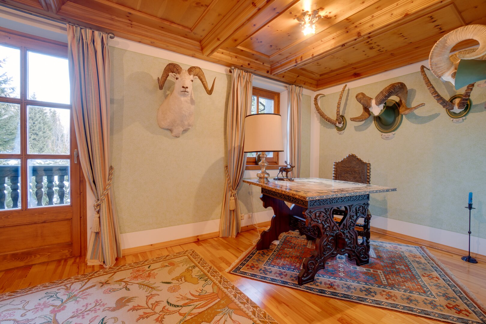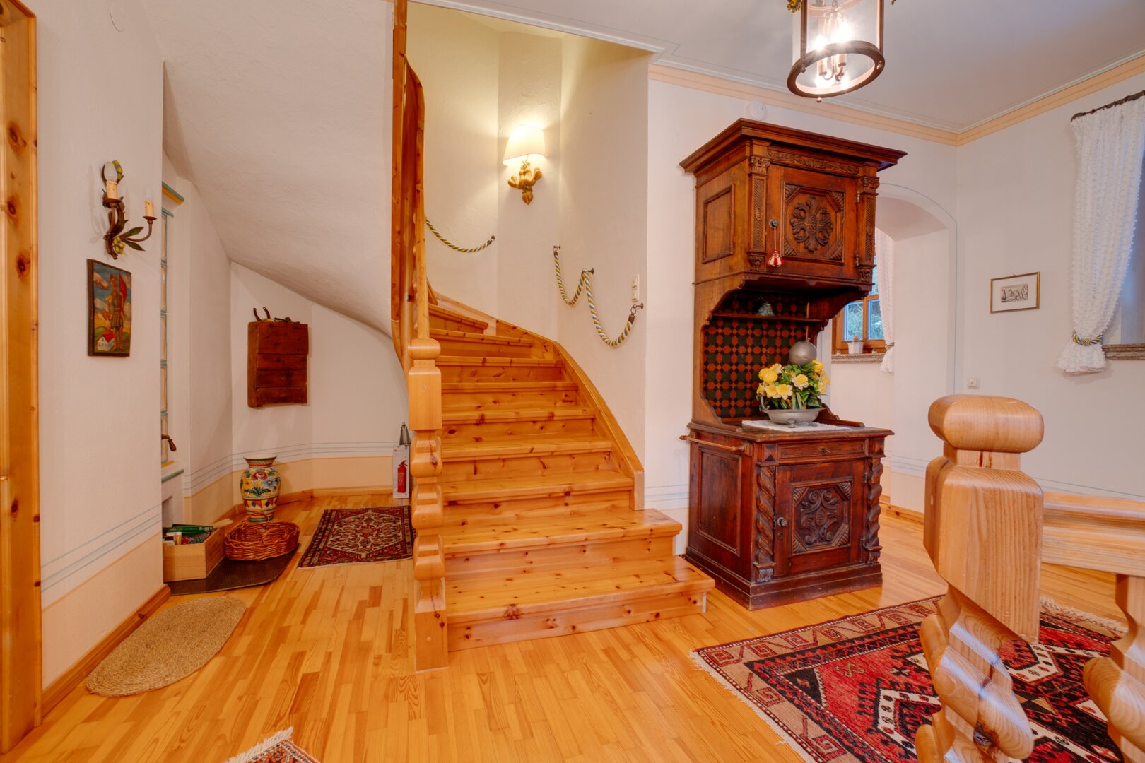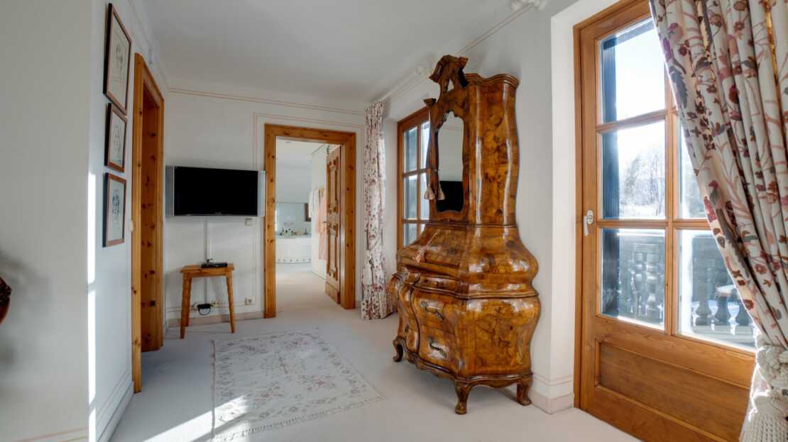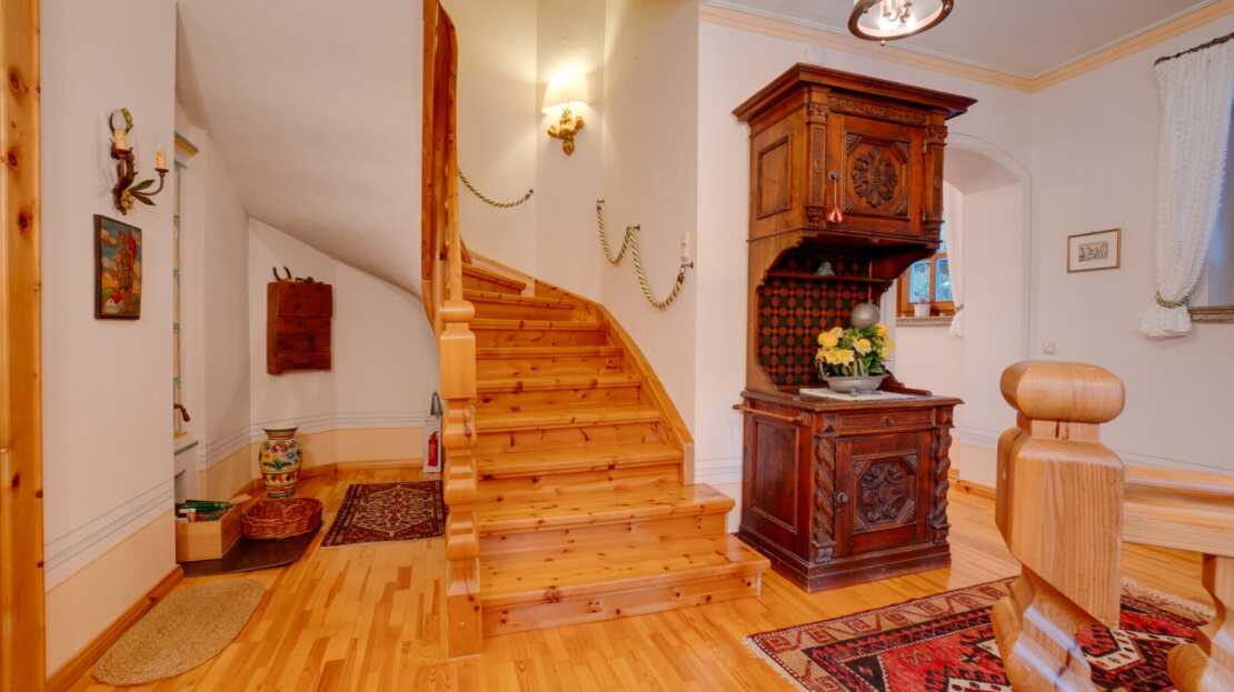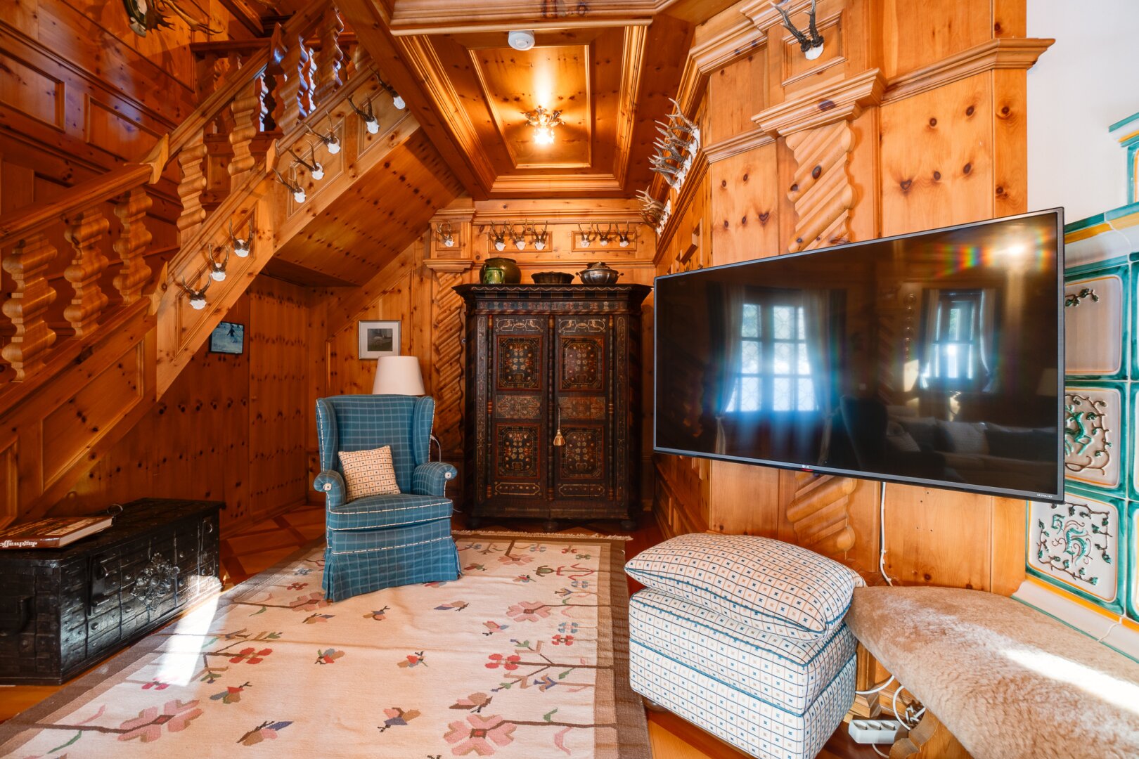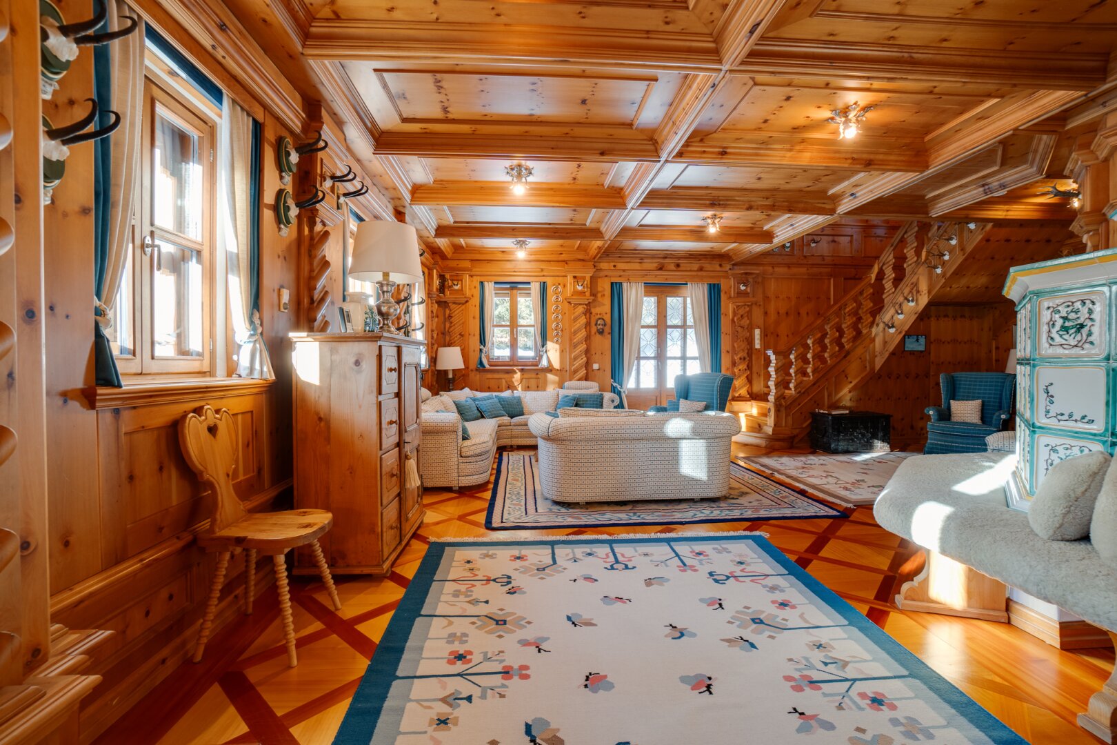 Das Interieur des großzügigen Chalets, welches von einem renommierten Architekten entworfen wurde, ist geprägt von einer hochwertigen, handgefertigten Zirbenholzausstattung, die mit unverwechselbarer Liebe zum Detail gestaltet wurde. Dies schafft eine Atmosphäre von Wärme und Geborgenheit, der Sie dem Alltagsstress entfliehen lässt. Ein Blickfang im Wohnbereich ist der Holzofen mit Kacheln aus der renommierten Gmundner Keramikmanufaktur, welcher für eine behagliche Wärme sorgt, während Sie den traumhaften Ausblick auf die umliegende Bergwelt genießen.